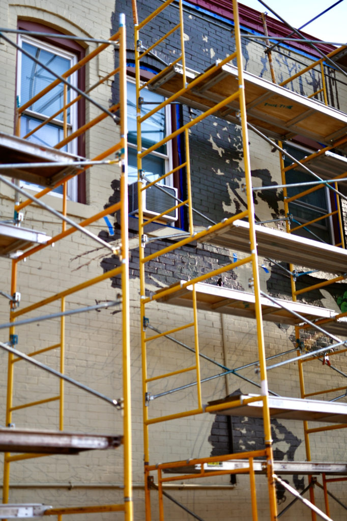 I’ve been up on scaffolding to paint a mural before. I did the Mondrian Garage Mural just down Third Street from the ‘Natural’ mural. When I designed the Mondrian Garage I intentionally kept the image minimal. I was relying on myself to complete a task I knew I could accomplish, but I still had gaps of knowledge. I suspected house paint was maybe the incorrect choice to use, I wasn’t sure what the choices even were. I needed the paint to keep the peeling, cracking wood veneer bound together. Three years on, I’m happy with how it is holding up to the brutal Marquette winters, even though I am told the colors are probably already fading.
