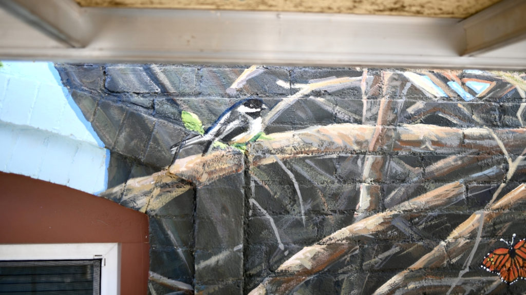 Behind me Tara swooped through turning my warm darks into a water fall with sparkling reflections. Traded a penciled owl, for one shaped out of light. Sabrina worked on feathers, Patty on winter cliffs, Michelle small critters, and Mia everywhere all at once after (and during) perfecting the form of the woman. Nowhere near a full accounting of everyone’s activity on the mural, just a taste.